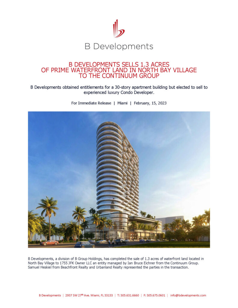 B Developments obtained entitlements for a 30-story apartment building but elected to sell to experienced luxury Condo Developer…